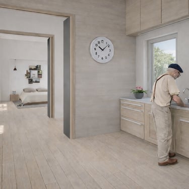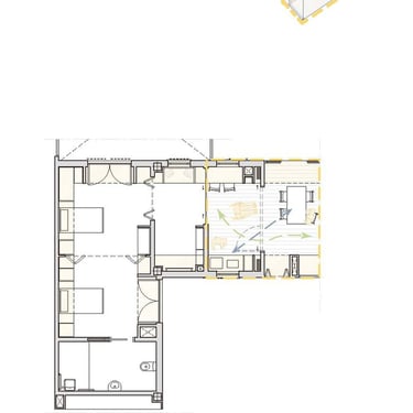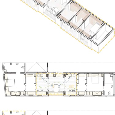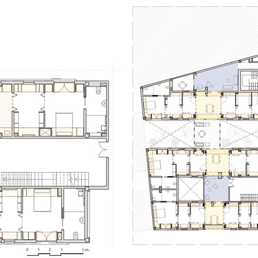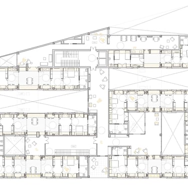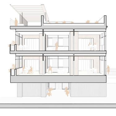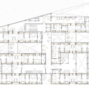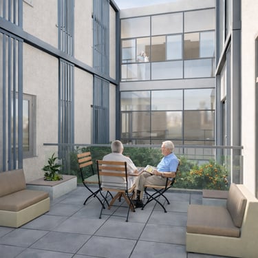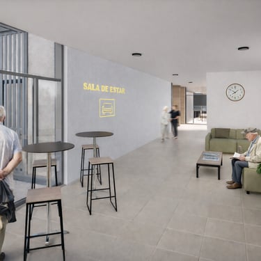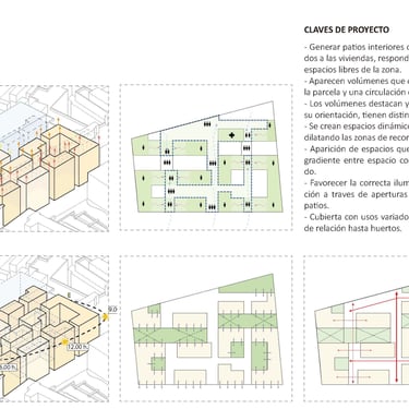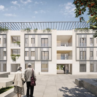 Proyecto de vivienda colectiva para la tercera edad organizado en torno a patios y espacios comunes. La propuesta fomenta la relación social, la autonomía y el contacto con el exterior mediante recorridos accesibles y ambientes confortables.